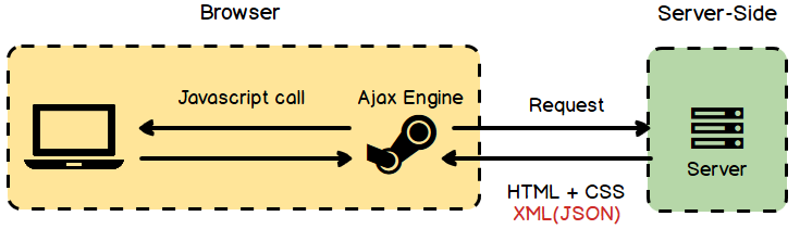 사용자가 AJAX가 적용된 UI와 상호작용하면, 서버에 AJAX 요청을 보내게 된다. 서버는 DB에서 데이터를 가져와서 JS 파일에 정의되어 있는 대로 HTML/CSS와 데이터를 융합하여 만든 DOM 객체를 UI에 업데이트 시킨다. 비동기로 이루어지며, 기존의 페이지를 전부 로딩하는 방식이 아닌 일부만 업데이트 하는 방식이다.